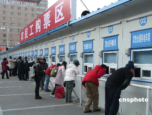 1月5日,北京西站西廣場上的70余個春運“臨時售票窗口”開始啟用,旅客紛紛在此購買去往全國各地的火車票。據悉,2009年北京的春運工作已從原來的1月11日提前至1月1日,2月19日結束,為期50天。今年春運的特點是學生流和民工流探親流三流重疊,春運壓力空前集中。針對近日來迅猛增長的節前客流,春運期間北京站和西站將會在站前廣場開辟臨時售票窗口,方便旅客購票。