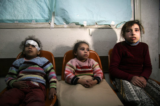 在以色列攻襲加沙中受傷的巴勒斯坦女孩在醫院外等候。6日,以色列部隊攻擊了聯合國在加沙地區設立的學校,造成數十人死亡。