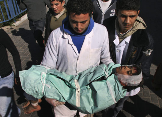 巴勒斯坦醫護人員懷抱著一具孩子的尸體。6日,以色列部隊攻擊了聯合國在加沙地區設立的學校,造成數十人死亡。