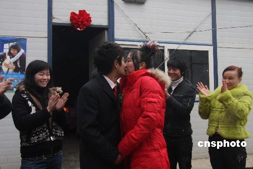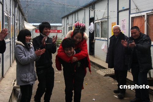 1月6日,地震重災區北川縣曲山鎮王家坪八組王昌明和妻子史悅在安置的板房里舉行簡樸而隆重的婚禮,許多親友和地震災區的群眾送來對他們新婚的美好祝福,在新年里給當地災區帶來了喜慶氣氛。