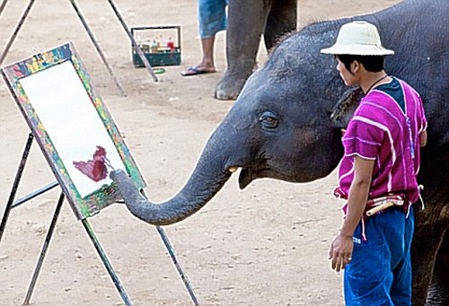 據英國媒體9日報道,泰國清邁有一群有藝術細胞的動物,11歲的亞洲象Lankam是其中一員,它已經創作了數百幅繪畫作品,最貴的一幅畫甚至賣到2萬英鎊。