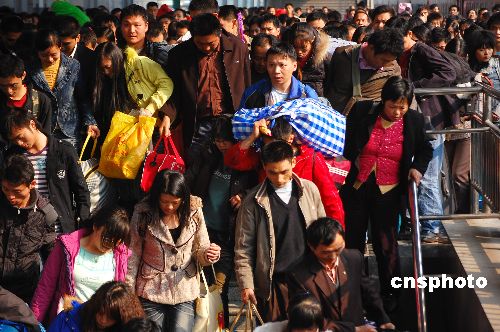 2009年1月10日,重慶北火車站迎來第一波春運客流高峰。由于外出務工人員提前返鄉,各大高校開始放假,民工流和學生流融合,重慶火車站在春運前夕迎來了首個客流高峰,重慶市各大汽車站、火車站當日都增開了加班車和臨客。2009年全國春運從1月11日開始,到2月19日結束,共計40天。中新社發 許康平 攝