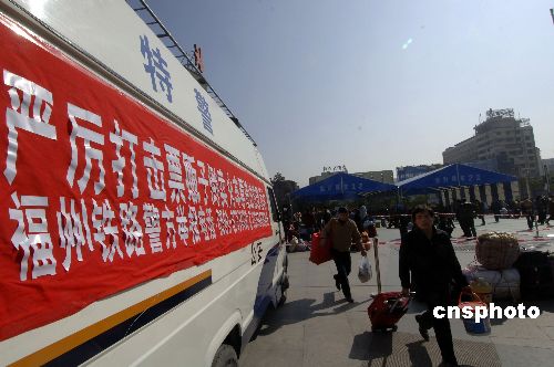 福州火車(chē)站廣場(chǎng)張貼舉報(bào)電話嚴(yán)打票販子。