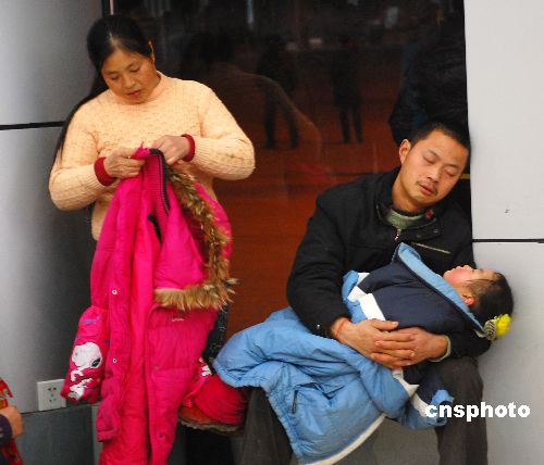 父女已經在等待中睡著了。中新社發 許康平 攝