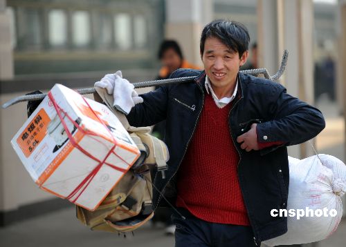 安徽亳州火車站上旅客用鋼筋打扁擔(dān)挑著自己的行禮。中新社發(fā) 張延林 攝