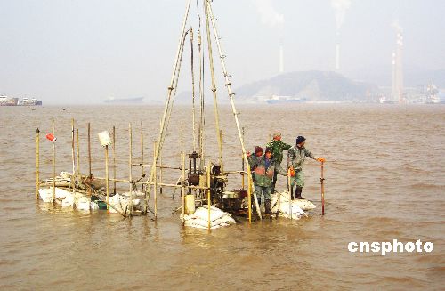 1月12日9時30分許,4名大橋施工員在浙江省臺州市海門港椒江二橋建設工地上測量時,被上漲的潮水困在港內工地上。接到報警后,臺州邊防支隊迅速派遣公邊艇前往營救,經(jīng)過近1個時努力,4人終于成功脫險。中新社發(fā) 郟策 攝