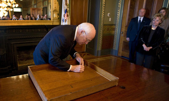 圖:美副總統切尼卸任前在百年辦公桌上留名