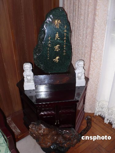 圖為七海寓所會(huì)客廳里擺放的一塊青石,上鐫刻蔣介石題寫的“賢良慈孝”四個(gè)大字。中新社發(fā) 路梅 攝