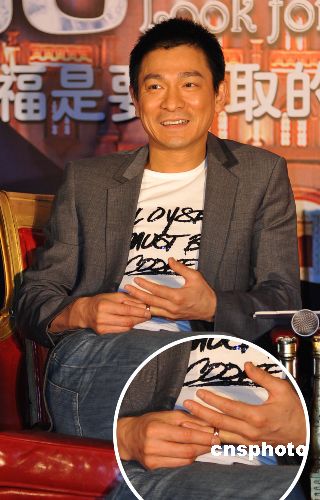 1月13日,由華誼兄弟出品、劉偉強執導的浪漫愛情大片《游龍戲鳳》舉行官網啟動儀式。劉德華出席活動時左手無名指驚現環形戒指,他在接受訪問時還不停的玩撫戒指,多次摘掉又戴上。中新社發 李學仕 攝