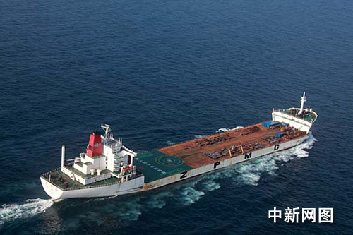 被護商船“振華十三”號在甲板上寫著“向人民子弟兵致敬”幾個白色大字。