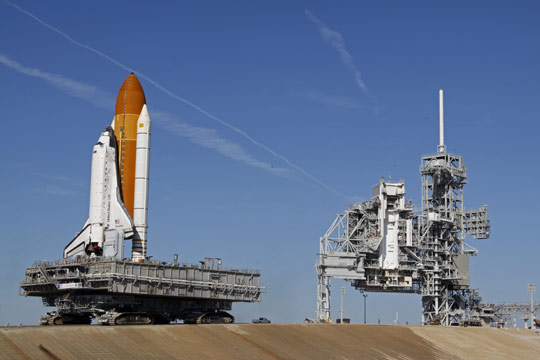 當地時間14日,美國“發現”號航天飛機“坐”著履帶車經過4英里的“旅行”,被運上位于佛羅里達州肯尼迪航天中心的發射臺。按計劃它將于2月12日發射升空前往國際空間站。