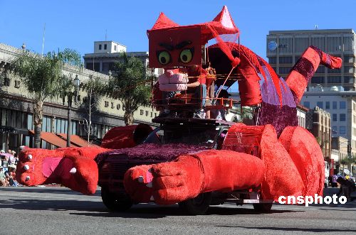 圖為巨貓花車招搖過市。中新社發 張煒 攝