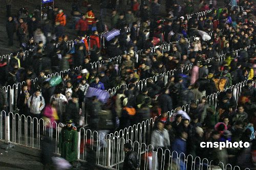 2009年1月19日晚,北京西客站客流大幅攀升,廣大旅客通過S形護(hù)欄有序進(jìn)站。面對今年的春運(yùn)客流,北京西站充分借鑒奧運(yùn)場館觀眾分流經(jīng)驗(yàn),提前部署,及早安排,在客流密集的北廣場東西雙向設(shè)置了兩處S形護(hù)欄,由工作人員在入口處指揮,分流、引導(dǎo)旅客有序進(jìn)站,確保了春運(yùn)安全。 中新社發(fā) 魯谷 攝