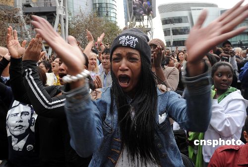 圖為非裔婦女夏莉·威爾遜看到奧巴馬就職興奮異常。中新社發 張煒 攝