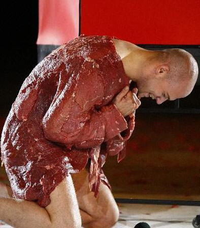 2008年7月19日,在克羅地亞的斯普利特,一名演員身穿生肉制成的演出服在舞臺上表演。