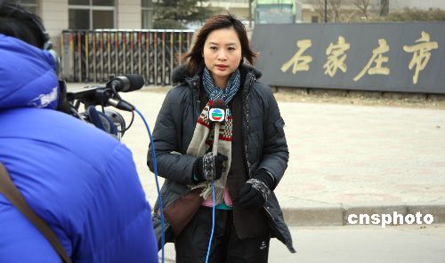 圖為當日上午,在石家莊中級法院門口,來自香港的電視臺記者冒著寒風做現場報道。中新社發 翟羽佳 攝