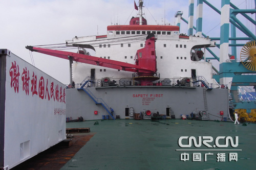 12月17日在亞丁灣海域遭遇索馬里海盜襲擊,成功逼退海盜的中國交通建設集團振華4號輪22日返回上海振華港機長興島修造基地。22日早上8:32分振華四號從長江橫沙錨地起錨向長興島行駛,10:30左右在振華港機長興島修造基地靠岸。記者吳善陽 王磊
