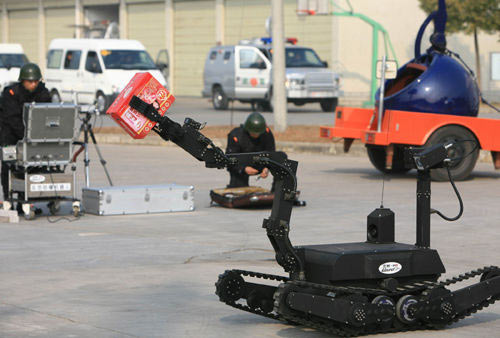 會搬運炸彈的機器人:在武漢舉行的一場反恐演練中,武警戰士使用機器人搬運“炸彈”。