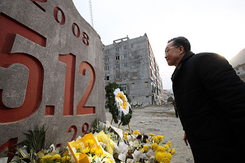 1月24日至25日,中共中央政治局常委、國務院總理溫家寶來到四川受災最為嚴重的北川、德陽、汶川等地,和災區人民一起過年。這是1月24日,溫家寶專程來到北川縣城遺址,在“5·12”地震紀念碑前向大地震中遇難的同胞們獻花、默哀。作者:姚大偉
