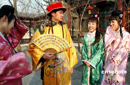 1月27日 (大年初二),北京大觀園十四屆紅樓廟會吸引眾多假日游客,本屆廟會以弘揚中華傳統(tǒng)文化為宗旨,以展現(xiàn)紅樓文化為主題,呈現(xiàn)出改革開放30年來新北京、新宣武的精神風(fēng)貌。廟會主要活動有“元妃省親”、“寶黛成婚”“賈母賀壽”、紅樓文化展覽--木版年畫展、紅樓夢人物火花展以及紅樓美食展示區(qū)等。圖為在紅樓廟會上一位扮成“皇上”的游客與紅樓十二釵談笑風(fēng)聲。中新社發(fā) 錢興強 攝