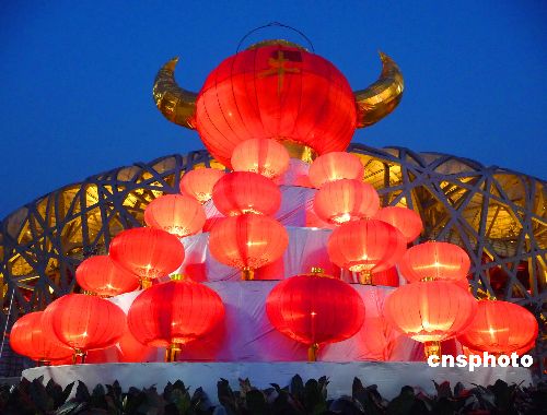 2009年1月31日傍晚,在北京奧林匹克公園中心區(qū)內(nèi),“金牛獻(xiàn)福”、“年年有余”、“鴻福滿倉”等鋼材結(jié)構(gòu)的雕塑及數(shù)千個大紅燈籠,在牛年春節(jié)期間首次被安放在園區(qū)人流較集中的地方,與“鳥巢”、“水立方”交相輝映。中新社發(fā) 玉龍 攝