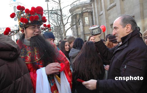 圖為中國“財神爺”在現場向英國市民派發紅包。中新社發 程嘉揚 攝