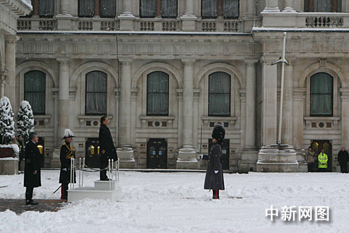 倫敦當地時間二月二日上午八時三十分許,正在對英國進行正式訪問的中國總理溫家寶,踏雪出席布朗首相在外交部舉行的歡迎儀式。圖為溫家寶在觀禮臺上檢閱儀仗隊。 中新社記者 張朔 攝
