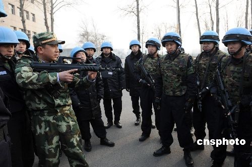 中國維和警察培訓中心教員向隊員講授激光模擬戰術系統使用方法。中新社發 由永懷 攝