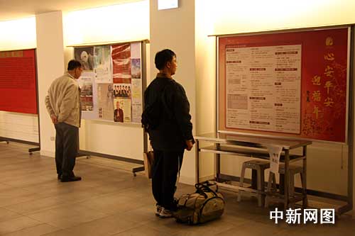臺灣法鼓山創辦人圣嚴法師三日圓寂,四日移靈金山法鼓山世界佛教教育園區大殿供信眾瞻仰,圖為五日晚一名信眾在瞻仰圣嚴法師法相后,正觀看圣嚴法師今年春節的最后祝福“心安平安迎福年”。 中新社記者:陳立宇 攝