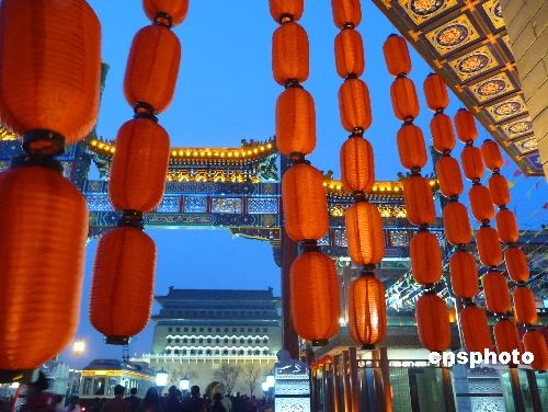 2009年2月8日,農(nóng)歷正月十四,千余盞大紅燈籠及中國結(jié)將北京前門大街妝扮出濃郁的節(jié)日氣氛。中新社發(fā) 玉龍 攝