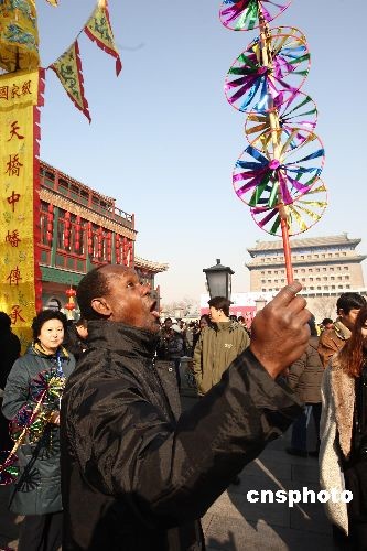 元宵節(jié)來臨,北京前門大街舉行民間花會(huì)踩街活動(dòng),一名外國(guó)觀眾手舉風(fēng)車玩得很過癮。踩街是一種中國(guó)傳統(tǒng)民間民俗藝術(shù)表演形式,類似國(guó)外的花車游行,表演隊(duì)伍邊行進(jìn)邊表演,百姓沿途觀看。中新社發(fā) 杜洋 攝