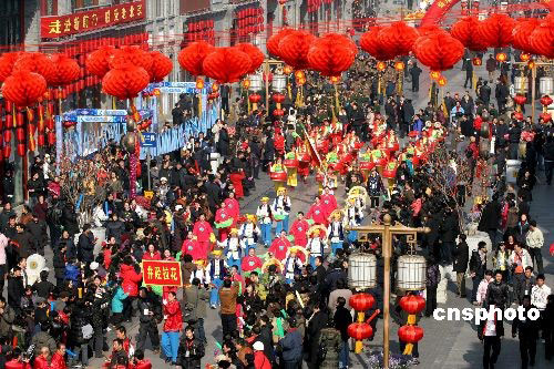 2月9日上午,來自北京、河北、山東等3個省市的12支花會隊,在前門大街舉行“傳統民間花會踩街”活動,喜迎正月十五元宵節的到來。踩街是一種中國傳統民間民俗藝術表演形式,類似國外的花車游行,表演隊伍邊行進邊表演,游客沿途觀看。花會隊從正陽門箭樓南側和前門五牌樓出發,16只南獅和北獅為大隊人馬開道,隨后中幡、旱船、二魁摔跤、地秧歌、鼓子秧歌等將依次向珠市口行進。