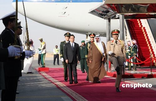 中國國家主席胡錦濤當地時間十日下午乘專機抵達沙特阿拉伯首都利雅得,開始此次亞非五國的友好合作之旅。沙特國王阿卜杜拉在機場舉行隆重儀式,歡迎胡錦濤主席到訪。