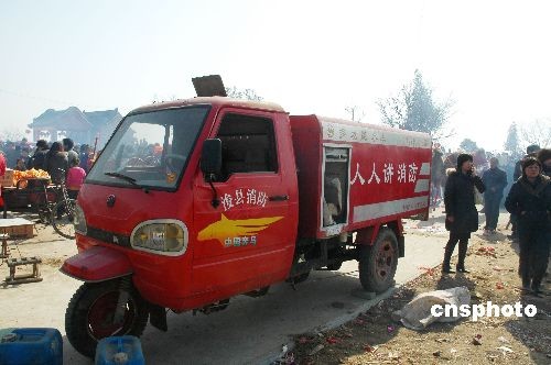 2月10日,河南浚縣大伾山景區停放了幾輛堪稱山寨版的“消防車”。此車是用奔馬三輪車改裝而成,外表同消防車極其相似,車身印有“浚縣消防,人人講消防”等字樣。 中新社發 賈建偉 攝