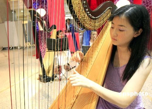 二月十二日,香港時(shí)代廣場舉辦情人節(jié)“I Love you Day”活動。美國國際豎琴大賽史上首位華人金獎得主于丹在場演奏助興。中新社發(fā) 張勤 攝