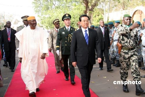 當(dāng)?shù)貢r(shí)間二月十二日下午,中國(guó)國(guó)家主席胡錦濤抵達(dá)非洲國(guó)家馬里訪問。圖為馬里總統(tǒng)杜爾舉行隆重儀式歡迎胡錦濤來訪。 中新社發(fā) 齊彬 攝