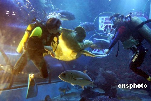 二月十四日,一對情侶在福州海底世界度過一個別樣的情人節(jié),體驗浪漫的海底之戀。在潛水員的指導下,二人潛入海底,在老壽星海龜、鯊魚及各種海洋魚兒的見證下交換愛情信物,互贈鮮花,水中擁吻,在無聲的水世界感受彼此的心跳以及游客的祝福。中新社發(fā) 楊婀娜 攝