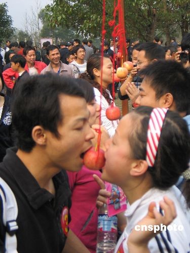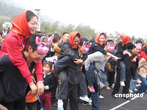 2月14日,江西宜春明月山風景區舉辦“天翼雙飛、情月相融”情人節系列活動,“豬八戒背媳婦”、“蘋果啃出愛情來”等豐富多彩的趣味活動吸引了3000余人參加。中新社發 鄒海斌 攝