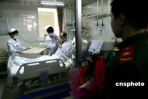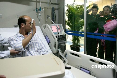圖為出院戰士在張少輝的病房前與其道別。中新社發 富田 攝