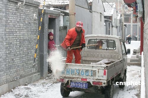 2月18日,北京的降雪持續了一整夜,給市民出行帶來了不便,北京環衛工人在東四地區胡同里拋灑融雪劑,更好的保證社區居民的正常出行。中新社發 杜洋 攝