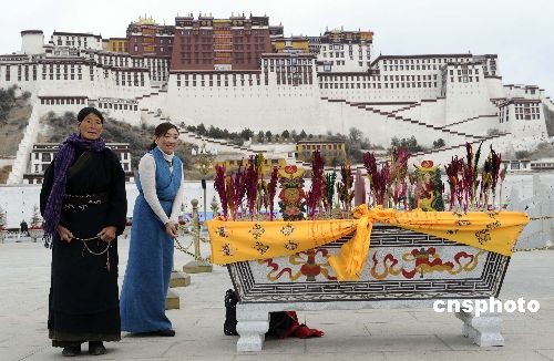 2月23日,拉薩布達(dá)拉宮廣場布置巨型“切瑪”迎接藏歷新年。現(xiàn)場這位藏族老阿媽稱這是她見過的最大的“切瑪”。藏歷新年時(shí),藏族民眾家家戶戶供“切瑪”,人人都嘗“切瑪”。當(dāng)客人走進(jìn)藏民家時(shí),主人首先會(huì)獻(xiàn)“切瑪”,客人從堆放在“缽”中的“切瑪”里拿出一點(diǎn)兒來,并說“扎西德勒”(吉祥如意之意),爾后放進(jìn)嘴里,預(yù)祝新春如意、身體康健。