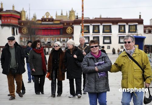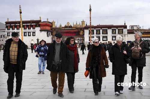 2月26日,中國藏歷年初二,十多名德國游客在西藏拉薩大昭寺前游覽,他們是通過中國國際旅行社總社組團來到西藏的。旅游日程包括參觀拉薩著名景點和藏民家庭旅館體驗住宿,德國游客表示藏民的熱情好客給他們留下了深刻印象。中新社發 廖攀 攝