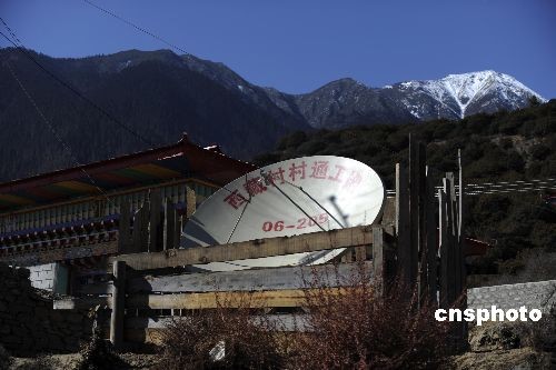 2009年初春,西藏林芝米林縣農(nóng)村的廣播電視“村村通”工程衛(wèi)星天線。西藏自治區(qū)廣播電視“村村通”工程2000年啟動以來,行政村至少可接收兩套以上電視節(jié)目和一套以上廣播節(jié)目,規(guī)模較大的行政村可收看4套以上電視節(jié)目。農(nóng)牧民聚居密度大的地方,還安裝了農(nóng)村小片網(wǎng)有線電視,可收看6套以上的電視節(jié)目。中新社發(fā) 廖攀 攝