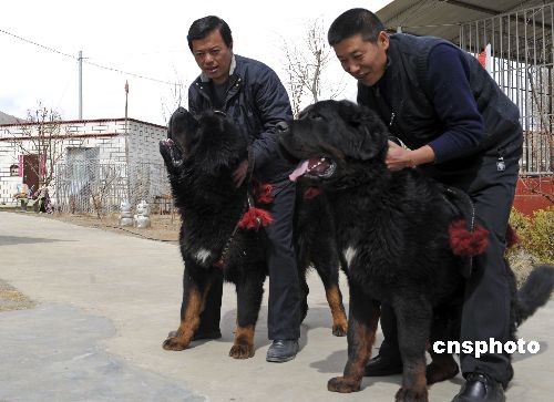 2009年春,西藏拉薩市郊,西藏藏獒協(xié)會(huì)養(yǎng)殖基地兩頭名為“喜馬”和“拉雅”的喜馬拉雅河谷型藏獒嬉戲。曾有客戶(hù)出價(jià)數(shù)百萬(wàn)元人民幣都未能如愿能買(mǎi)走“喜馬”。據(jù)了解,全世界像“喜馬”這樣的純血統(tǒng)藏獒不到200只,全西藏也只有20只左右。 牦牛、禿鷲與藏獒被稱(chēng)為西藏三寶。中新社發(fā) 廖攀 攝