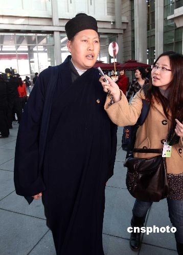 3月1日,赴北京參加“兩會”的全國政協委員、四川省道教協會會長、青城山天師洞道觀道長唐誠,剛一抵達北京機場就被記者追訪。2OO9年全國“兩會”即將開幕,代表、委員們已開始陸續抵京報到。中新社發 杜洋 攝