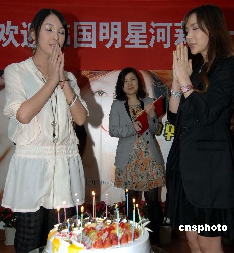 韓國知名藝人、第一變性美女河莉秀(右)與中國第一變性美女陳莉莉(左)相聚福州,并共同在許愿蛋糕前許心愿。中新社發(fā) 劉可耕 攝