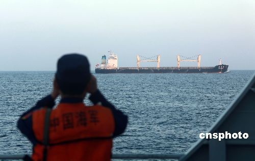 中國海軍護航編隊“海口”號導彈驅逐艦完成接護遭海盜襲擊商船“雁蕩海”號任務。圖為2月26日,接護途中護航官兵對商船進行了望、警戒。2月25日,“雁蕩海”號由于供貨期限原因未能參加護航,在亞丁灣海域航行途中遭遇海盜襲擊。中新社發 孫自法 攝