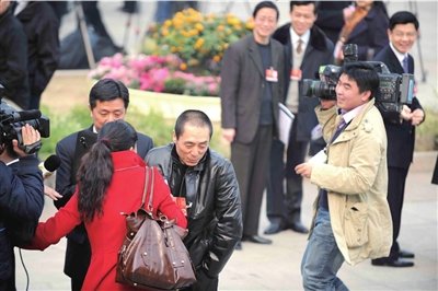 一個電視臺的女記者攔住張藝謀委員,央求給點兒“下鍋菜”,否則回去沒法交差。范繼文 攝