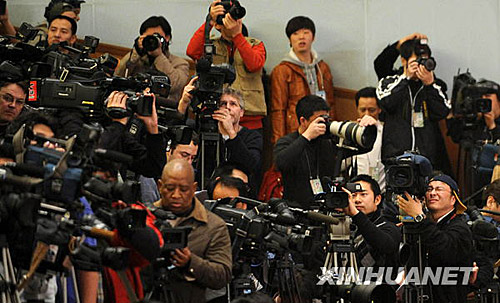 3月5日,第十一屆全國人民代表大會第二次會議在北京人民大會堂開幕。這是記者在會場采訪。黃敬文 攝