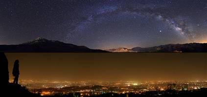 “夜空下的世界”項(xiàng)目的另外一重要目標(biāo),就是提醒人類注意城市燈光污染。現(xiàn)在城市明亮的燈光已讓人們很難看到夜空中的星星。本圖上半部分的弧形,其實(shí)就是伊朗北部上空的銀河,而下半部分則是燈光污染的德黑蘭。耀眼的燈光在照亮世界的同時(shí)也帶來了燈光污染,太亮的燈光可能導(dǎo)致居民無法安睡、司機(jī)駕車炫目等。對(duì)天文學(xué)家和天文愛好者來說,眾多的強(qiáng)亮光還嚴(yán)重影響他們觀測(cè)星空。世界多個(gè)國家已經(jīng)開始與燈光污染作斗爭(zhēng),比如在一些新開發(fā)的地區(qū),要求安裝不正對(duì)空中的燈光裝置,鼓勵(lì)夜晚照明燈光全部射向地面。